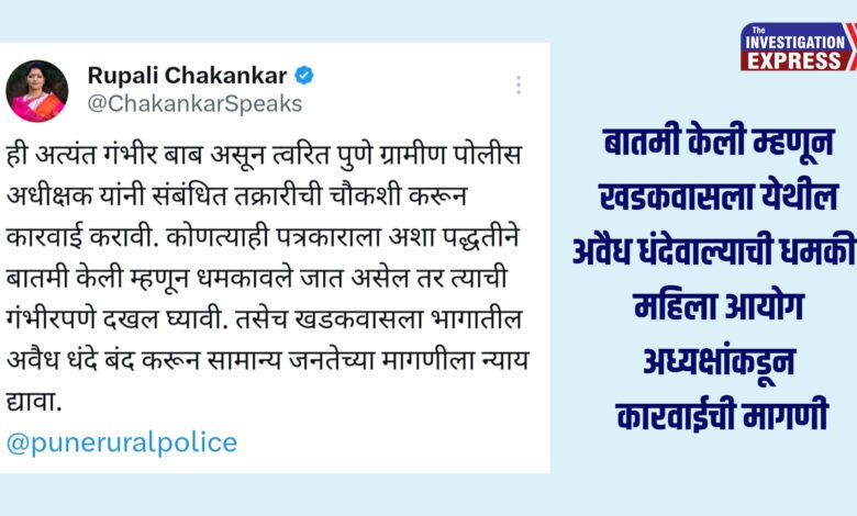 पुणे: हवेली पोलीस ठाण्याच्या हद्दीतील अवैध धंद्यांची बातमी केली म्हणून खडकवासला येथील एका गंभीर गुन्हे दाखल असलेल्या अवैध धंदेवाल्याने शिवीगाळ करत जीवे मारण्याची धमकी दिली आहे. याबाबत संबंधित अवैध धंदेवाल्याविरोधात हवेली पोलीस ठाण्यात गुन्हा दाखल करण्यात आला असून राज्य महिला आयोगाच्या अध्यक्षा रुपाली चाकणकर यांनीही ट्विटरद्वारे पुणे ग्रामीणचे पोलीस अधीक्षक अंकित गोयल यांच्याकडे तातडीने कारवाई करण्याची मागणी केली आहे.