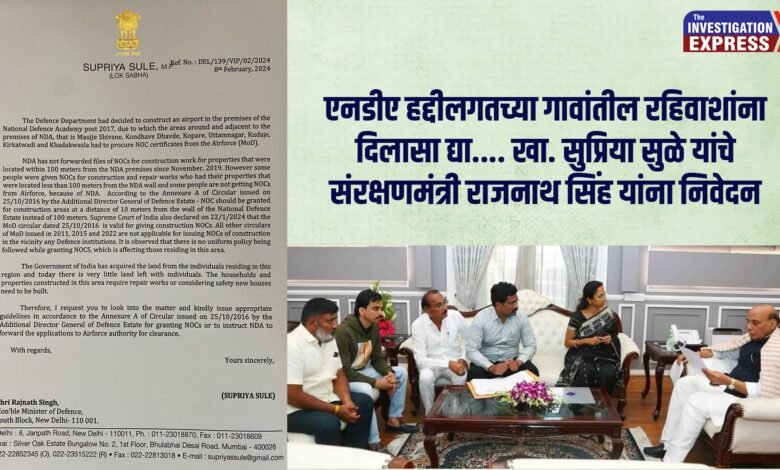 पुणे: एनडीए हद्दीलगतच्या गावांतील घरांचा पुनर्विकास व नवीन बांधकामांवर संरक्षण विभागाने निर्बंध घातलेले आहेत. पुनर्विकास किंवा नवीन बांधकाम करण्यासाठी संरक्षण विभागाकडून ना हरकत दाखला घ्यावा लागत असून त्यातही दिरंगाई होत असल्याने रहिवाशांना मनःस्ताप सहन करावा लागत आहे. त्यामुळे संरक्षण मंत्रालयाने जाचक अटी दूर करुन नागरिकांना दिलासा द्यावा यासाठी खासदार सुप्रिया सुळे यांनी रहिवाशांसह संरक्षणमंत्री राजनाथ सिंह यांची भेट घेऊन त्यांना याबाबतच्या विविध मागण्यांचे निवेदन दिले आहे.