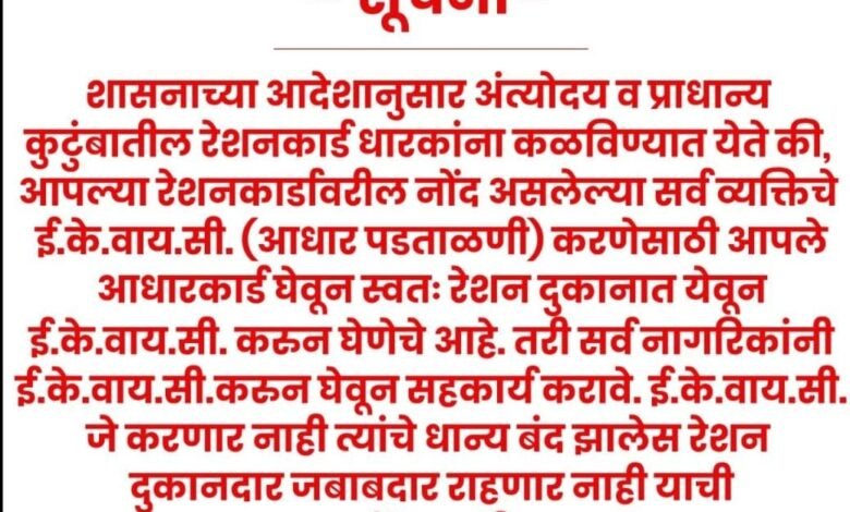 पुणे: स्वस्त धान्य दुकानांच्या माध्यमातून धान्य मिळत असलेल्या सर्व लाभार्थ्यांना ई-केवायसी करणे गरजेचे आहे. यासाठी 31 ऑक्टोबरपर्यंत मुदत देण्यात आली आहे. ज्या लाभार्थ्यांचे ई-केवायसी होणार नाही, त्यांचे धान्य बंद होणार आहे. त्यामुळे सर्व लाभार्थ्यांनी स्वस्त धान्य दुकानदाराकडे जाऊन 31 ऑक्टोबर पूर्वी ई-केवायसी करावी, असे आवाहन अन्न नागरी पुरवठा विभागाच्या वतीने करण्यात आले आहे. तसेच ई-केवायसी अभावी कार्ड बंद पडल्यास अथवा धान्यापासून वंचित राहिल्यास स्वस्त धान्य दुकानदार, पुरवठा विभाग अथवा परिमंडळ कार्यालय जबाबदार रहाणार नाही, असा इशारा देण्यात आला आहे. तरी नागरिकांनी याची नोंद घ्यावी व तात्काळ ई-केवायसी करून घ्यावी.