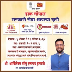 - किरकटवाडी: भारतीय पोस्ट विभागाचे खडकवासला पोस्ट कार्यालय व किरकटवाडीचे माजी उपसरपंच आर्किटेक्ट नरेंद्र हगवणे यांच्या संयुक्त विद्यमाने किरकटवाडी येथील भैरवनाथ मंदिराजवळ असलेल्या सरकारमान्य स्वस्त धान्य दुकानात विशेष शिबीराचे आयोजन करण्यात आले आहे. आजपासून या शिबीराला सुरुवात झाली असून 10 ऑगस्ट पर्यंत सकाळी 10 ते सायंकाळी 6 वाजेपर्यंत हे शिबिर सुरू असणार असून याचा लाभ घेण्याचे आवाहन पोस्ट अधिकारी व नरेंद्र हगवणे यांच्या वतीने करण्यात आले आहे.
