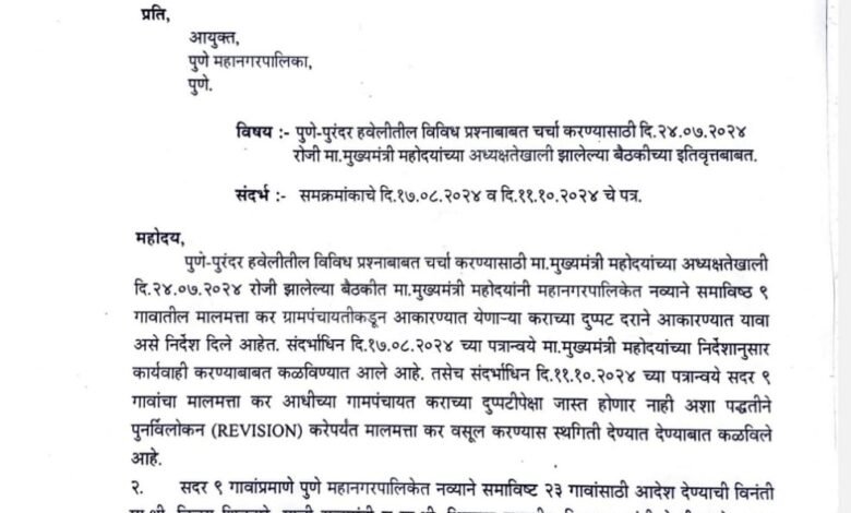आचारसंहिता लागण्याच्या अगोदर दि 15 ऑक्टोबर 2024 रोजी नगरविकास विभागाने पुणे महानगर पालिकेला पत्र लिहून समाविष्ट 32 गावांतील ग्रामपंचायतींपेक्षा दुप्पट मालमत्ता कर आकारण्याच्या आदेशाला पुनरावलोकन(Revision) करेपर्यंत स्थगिती द्यावी असे कळविले. नगरविकास विभागाचे हे पत्र समाज माध्यमातून व्हायरल झाले व सत्ताधारी पक्षांचे पदाधिकारी या पत्रावरुन जल्लोष साजरा करु लागले.