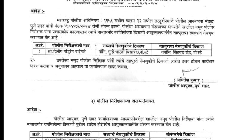 सिंहगड रोड पोलिस स्टेशनच्या पोलीस निरीक्षकांची तडकाफडकी बदली; पोलीस आयुक्त अमितेश कुमार यांचे आदेश; ‘ते प्रकरण’ भोवल्याची चर्चा